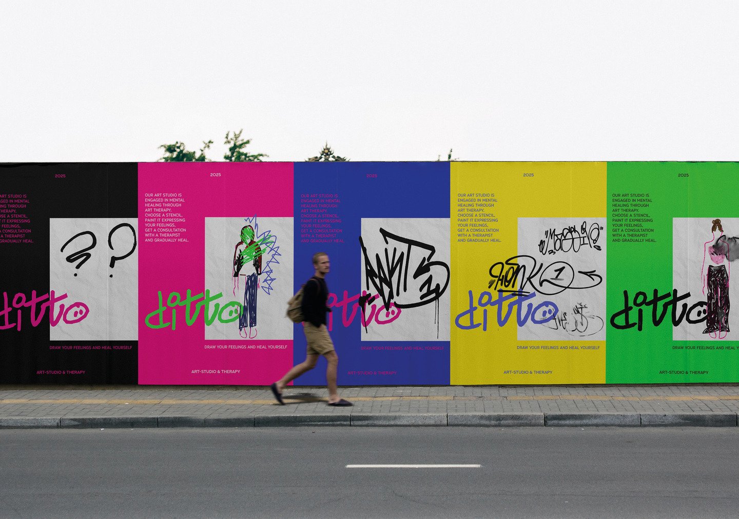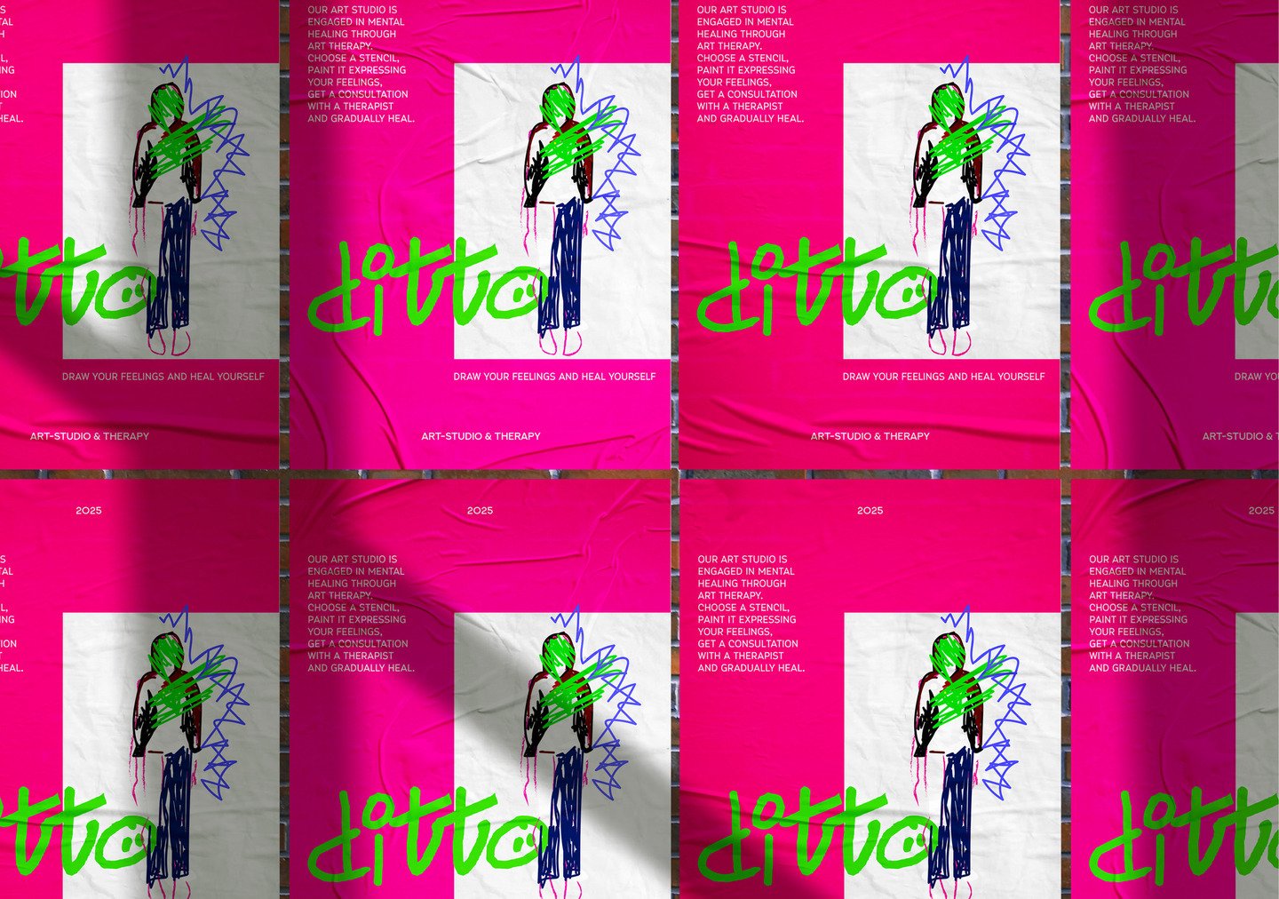 incorporating graffiti-style patterns derived from the attached photos. The logo should feel creative, expressive, and vibrant, reflecting the therapeutic and artistic nature of the art therapy studio. also add «Ditto» naming.