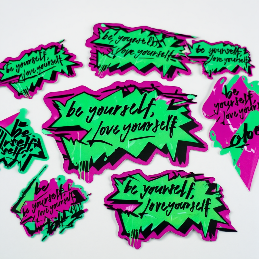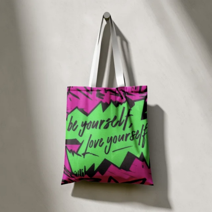 Промпт: Art Therapy Sticker Collection: Vibrant sticker pack with graffiti-inspired self-love messages & Art Therapy Tote Bag: Canvas tote bag with vibrant graffiti-inspired art therapy branding