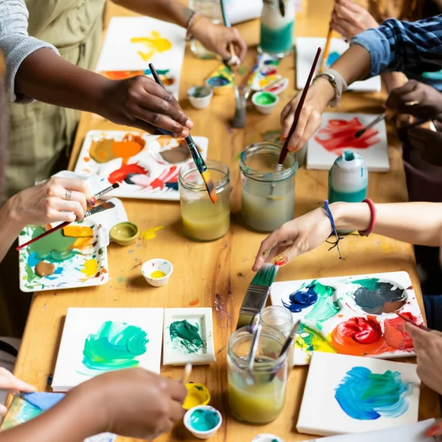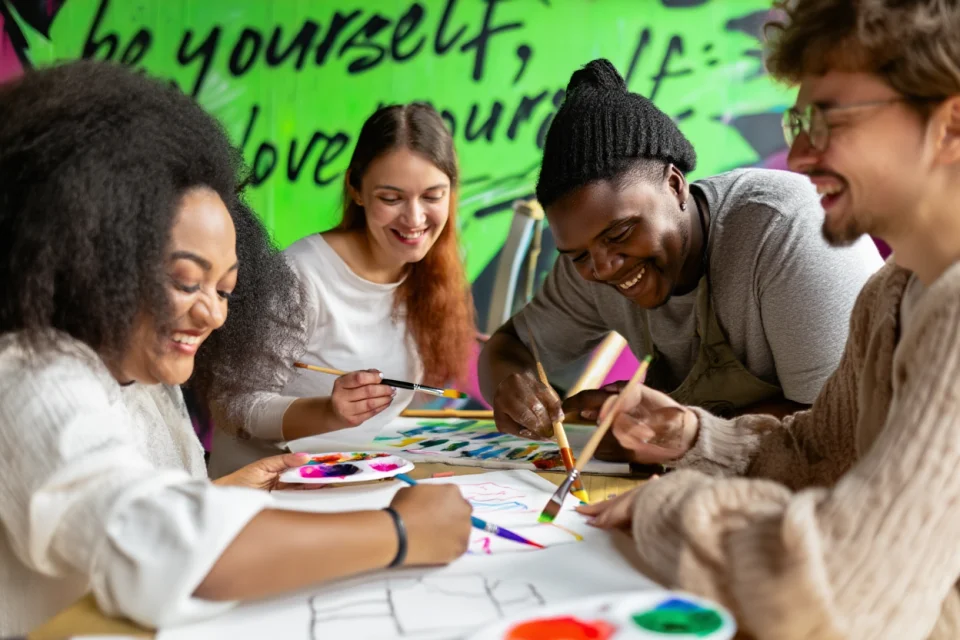 Промпт: Diverse group engaged in art therapy activities in the vibrant studio & Intimate portrait of art therapy participants in the vibrant studio