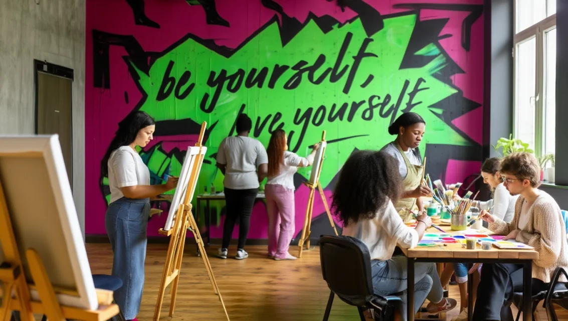 Студия, где проходит арт-терапия с клиентами. Промпт: Studio Workshop Area: Group workshop space with vibrant graffiti-inspired interior design
