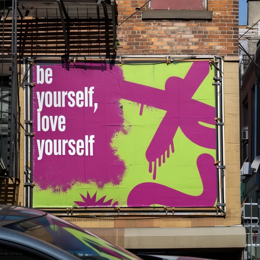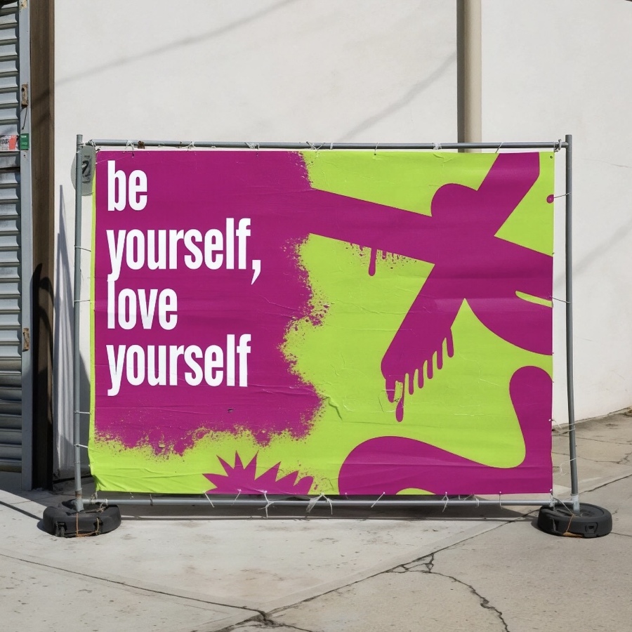 Промпт: Multiple Banner Installation — Self Love: Multiple street banners spreading the self-love message in vibrant neon colors