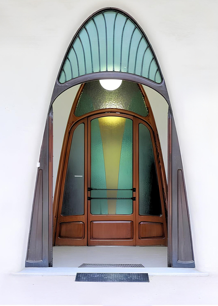 Двери этого периода отличались плавными линиями, асимметрией и органическими мотивами. Они перестают быть утилитарным проемом и становятся частью фасада словно вырастают из архитектуры. Стеклянные вставки, кованые элементы и резьба создают ощущение движения.