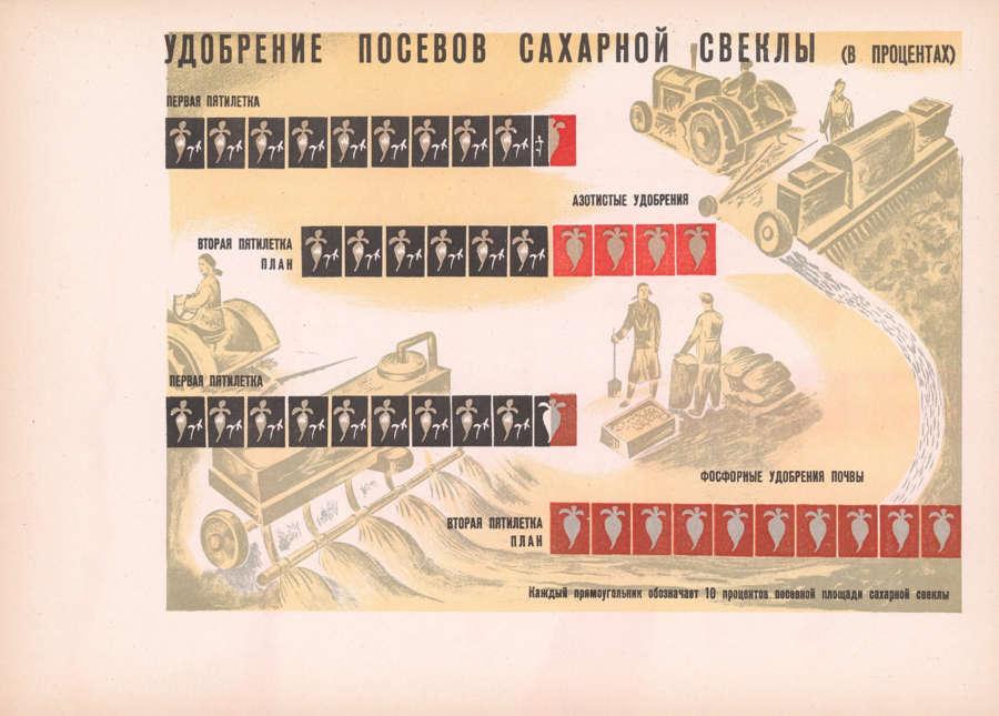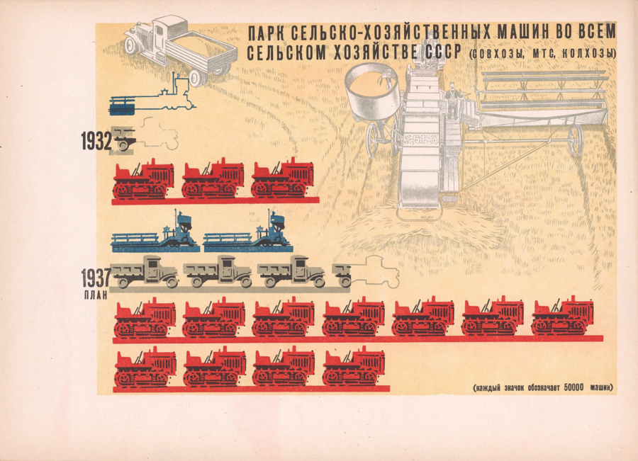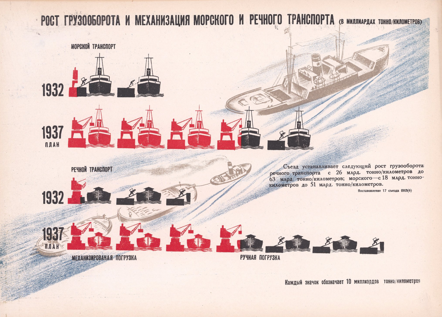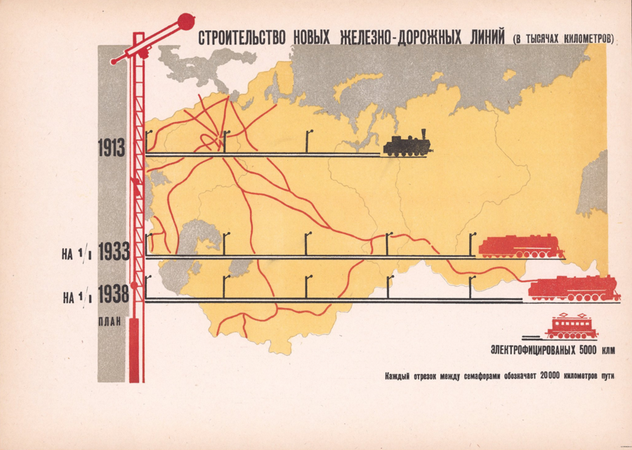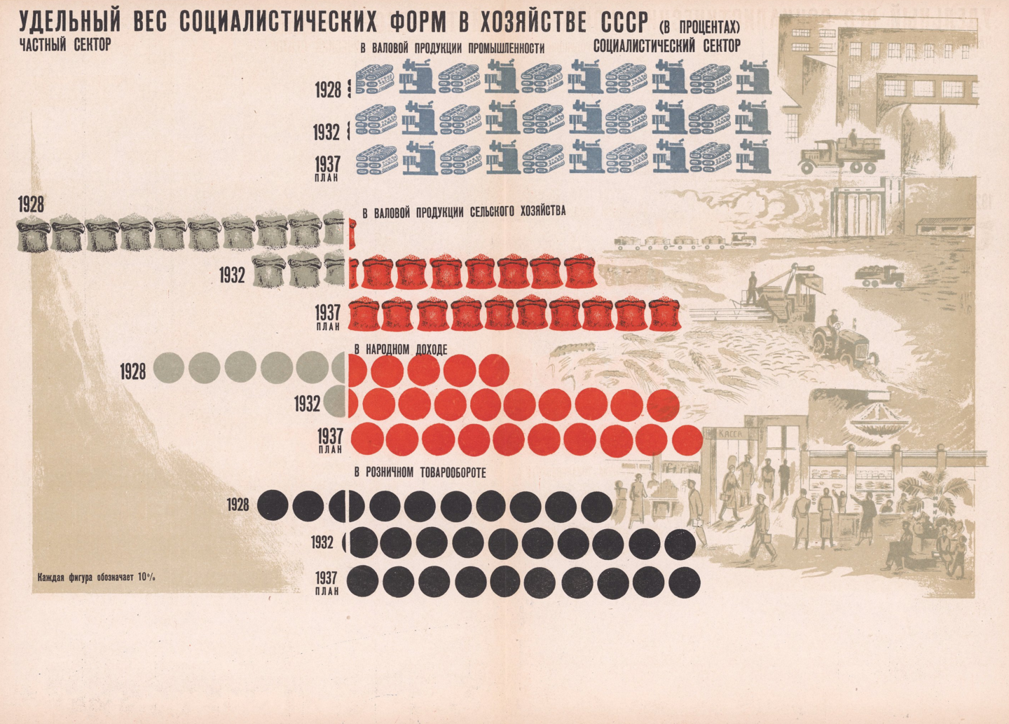 [1920 — 1930] Наблюдается период революционной пропаганды, появление первых статистических отчетов. Вводится плановая экономика. Инфографика становится частью государственной статистики.