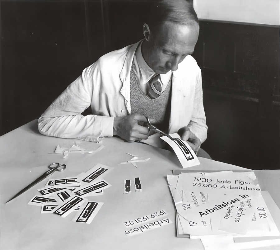 «Визуальная программа для отображения фактов и количественной информации, система ISOTYPE, была создана на основе исследований и теорий Отто Нейрата (1882–1945), венского философа, экономиста и социолога. В детстве он был очарован египетскими иероглифами — их формой и способностью передавать историю. Это раннее увлечение повлияло на его дальнейшую работу — создание системы для наглядного представления статистики.» [1]