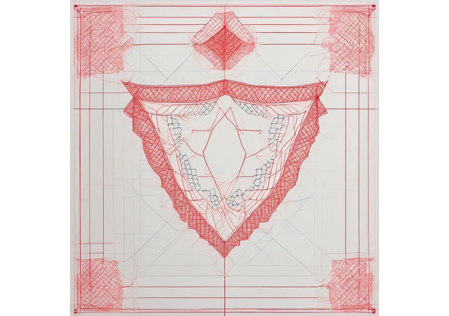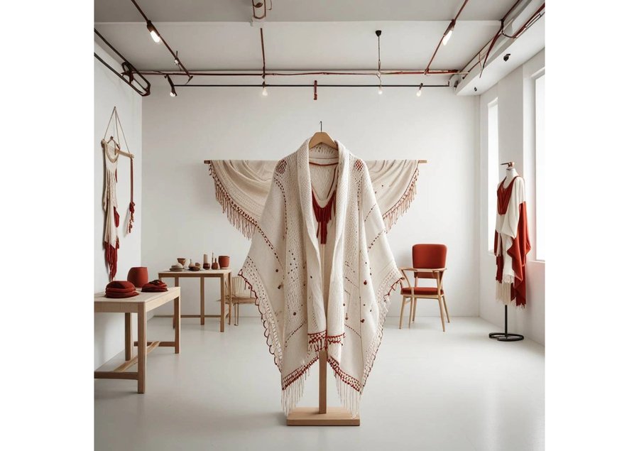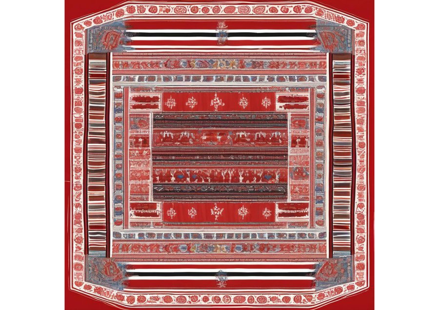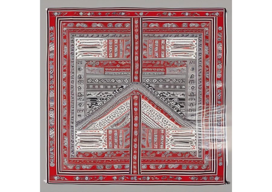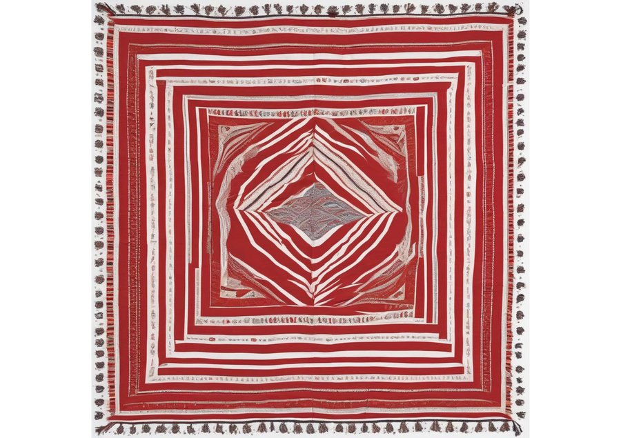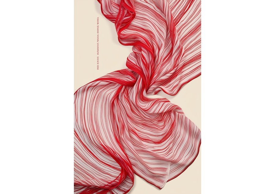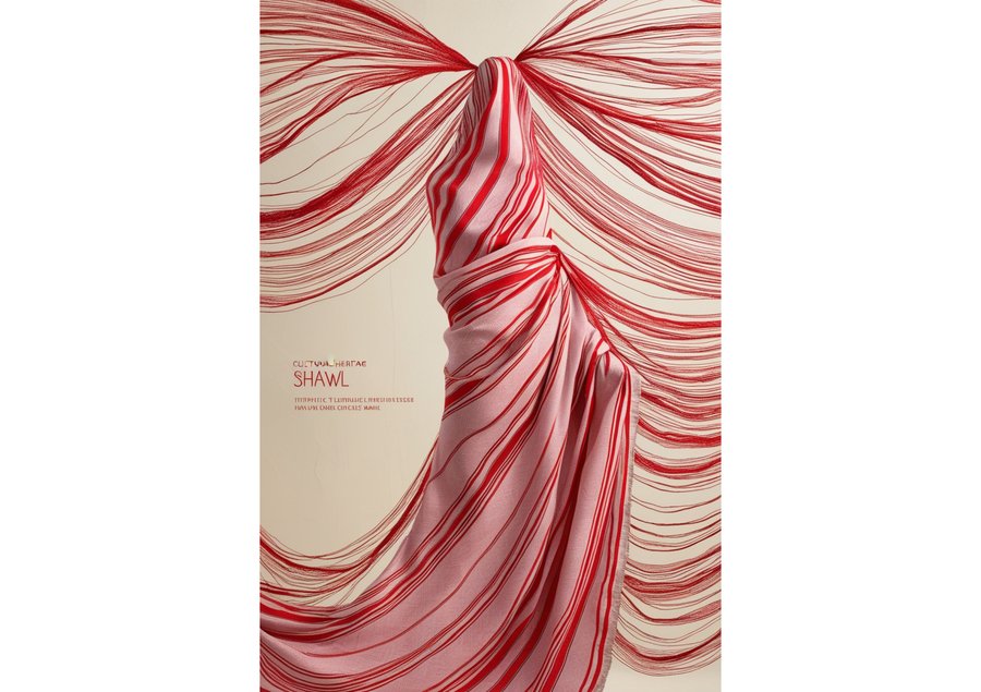 сreate a vibrant and intricate poster featuring a stunning shawl as the central element, with delicate thin red lines woven throughout to represent the patterns and textures of the fabric. The shawl is draped elegantly, filling the majority of the frame, with the red lines dancing across its surface in a mesmerizing display of color and design. The background is a soft, creamy white, providing a subtle contrast to the bold, crimson lines. The overall aesthetic is one of cultural heritage and traditional craftsmanship, with the shawl taking center stage as a testament to the beauty of handmade textiles.