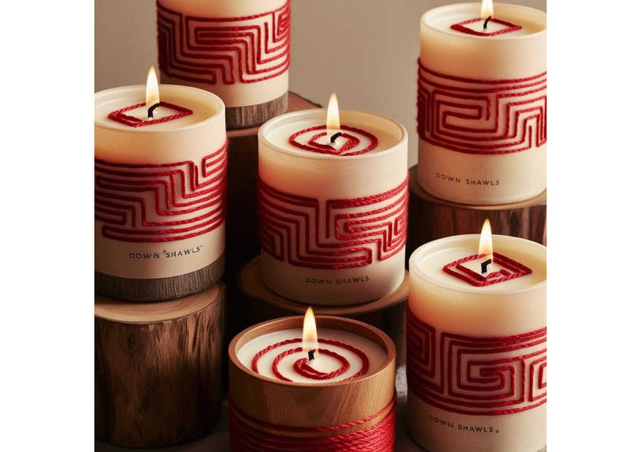 render a warm and cozy scene featuring an arrangement of candles that embodies the brand identity of down shawls, characterized by intricate red thread patterns and natural wood accents. The candles, with a rustic, handcrafted appearance, have red threads woven into their bodies, forming a maze-like pattern that echoes the brand’s signature style. The wooden accents, possibly in the form of candle holders or surrounds, add a sense of earthiness and sophistication. The overall color palette is muted, with the warm glow of the candles casting a soft, golden light on the surrounding environment. The image should evoke feelings of comfort, warmth, and serenity, perfectly capturing the essence of the down shawl brand.