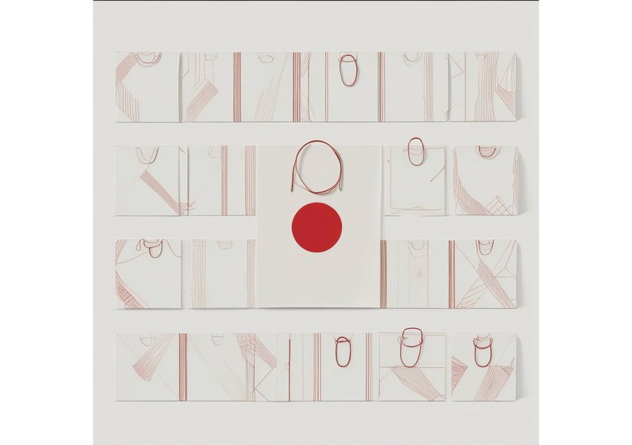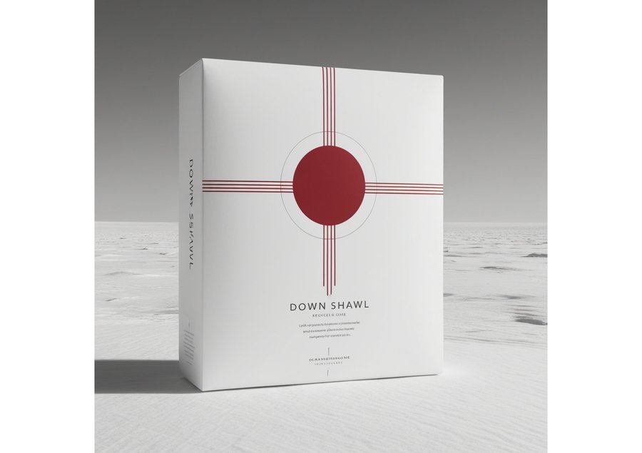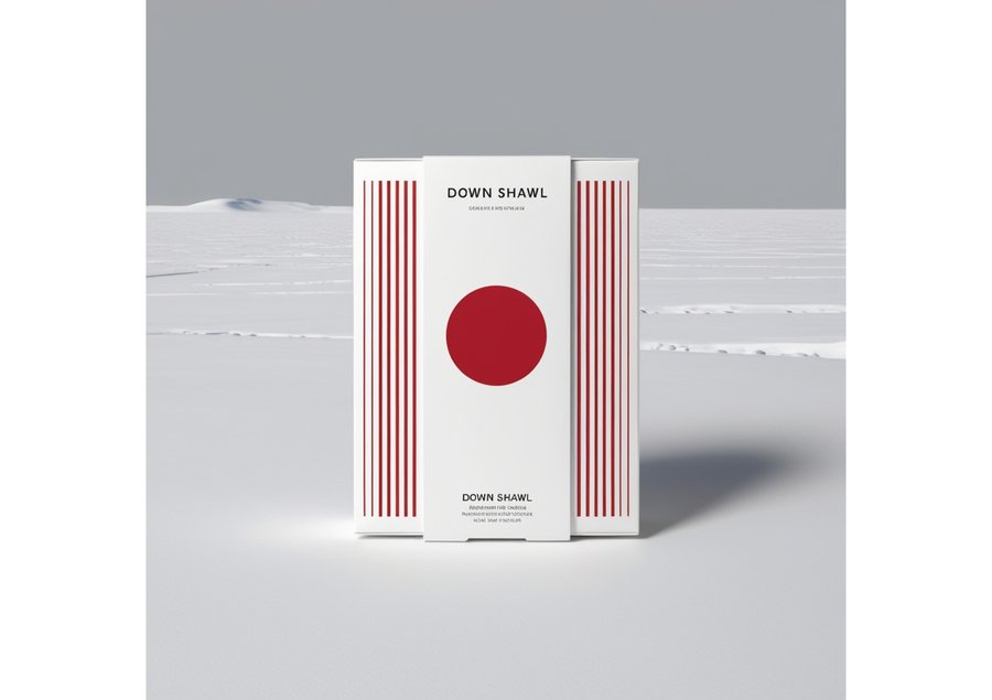 а minimalist rectangular packaging design for a down shawl with a predominantly white background, evoking the vast, barren landscapes of the steppes. The focal point is a bold, crimson circle with a precise, geometric shape, situated centrally on the packaging, surrounded by a series of thin, parallel red lines that converge at the circle’s center, creating a sense of movement and energy. The red accents are sparse, yet impactful, adding a touch of modernity and sophistication to the overall design. The typography is clean, sans-serif, and judiciously applied, providing essential information about the product in a subtle, unobtrusive manner.