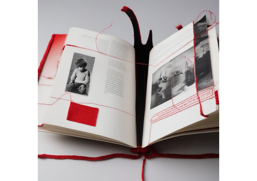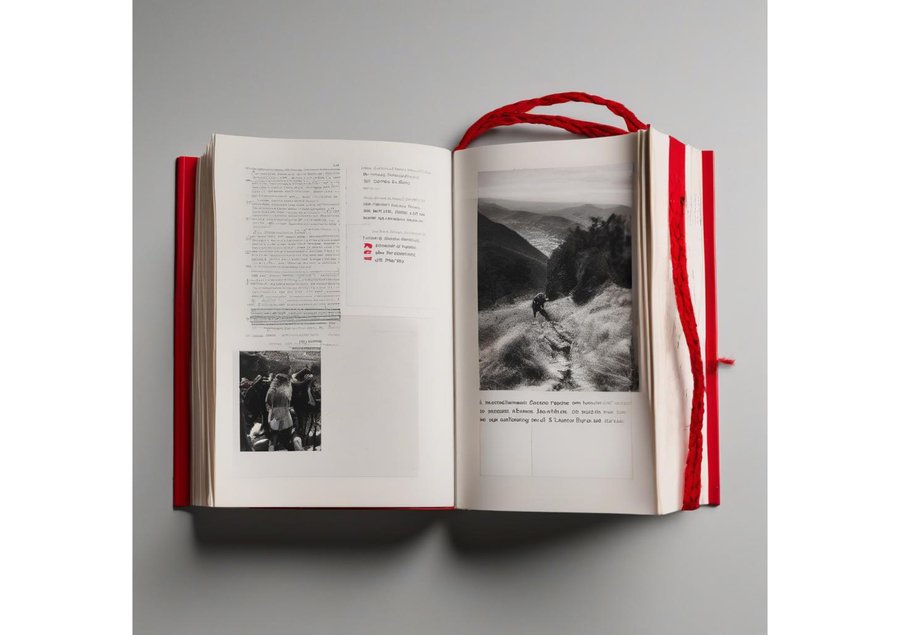 create a brand dnc book dedicated to prairies, using red wool threads and black and white photos, open spine, book sewn with red threads.