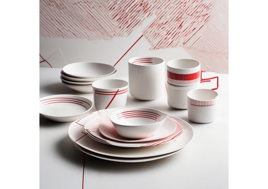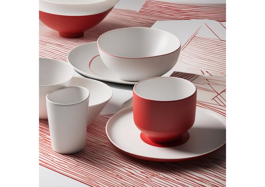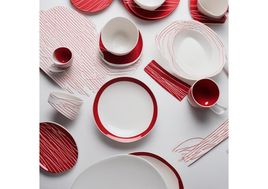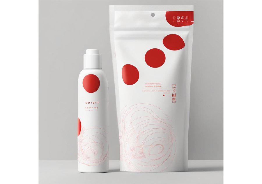 depict the care products for woolen clothing brand, using white and red elites, red stripes in Japanese asceticism style.