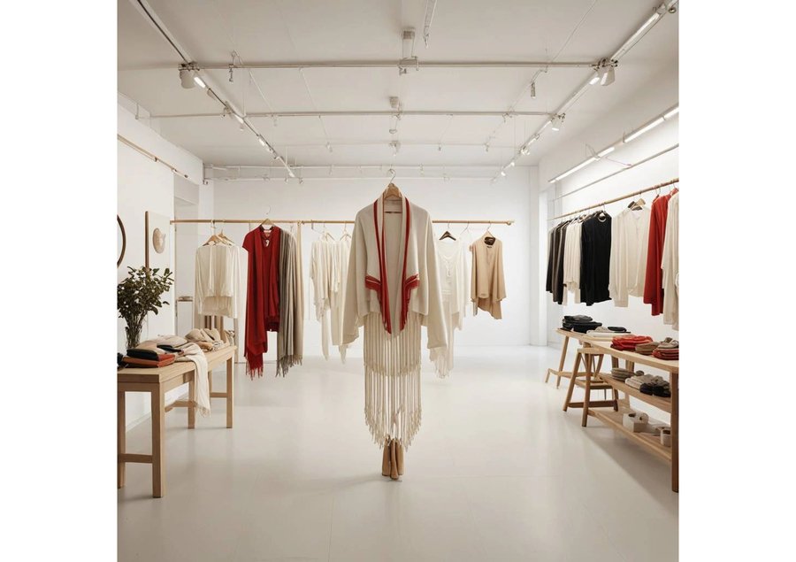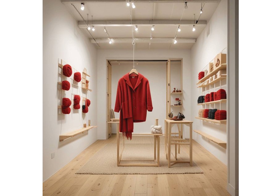 create a store space for a brand that creates down shawls with a modern twist, use white, wood, red threads.