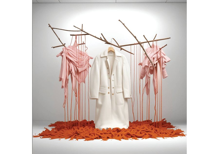 depict a modern art installation with a stretched down white shawl and leafless sticks with red threads and wattle, create a warm pleasant lighting and white background.