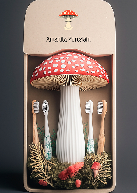 Promt: Create a photorealistic image of a porcelain toothbrush holder designed in the shape of a fly agaric mushroom. The top of the holder should resemble the iconic red mushroom cap with a smooth, glossy finish and subtle speckling to mimic natural textures. The mushroom stem serves as the base, with a matte porcelain texture, and features carved slots to securely hold toothbrushes. Each toothbrush slot should pass through the mushroom cap, allowing the toothbrush heads to protrude slightly above the cap while the handles extend downward like mushroom gills. The toothbrushes should have a mix of bright colors, such as blue, pink, and black, with modern, ergonomic designs. The background should be minimal and dark to highlight the vibrant colors and glossy surfaces of the holder, with soft lighting that emphasizes the realistic texture and craftsmanship of the porcelain. The overall composition should balance whimsy and functionality, blending a playful design with a high-quality, elegant finish.