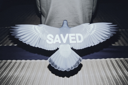 (3) Style: Custom01 image prompt/ Dynamic shot of a pigeon flying in motion blur with word «SAVED» written on his wings.