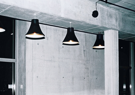 (13-14) Style: Custom01 image prompt/ Modern urban bar brutalist interior with concrete walls and chairs and table and big loft style urban lamps above.