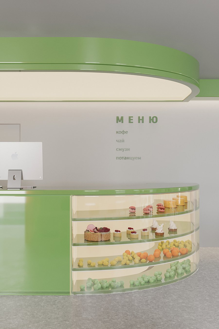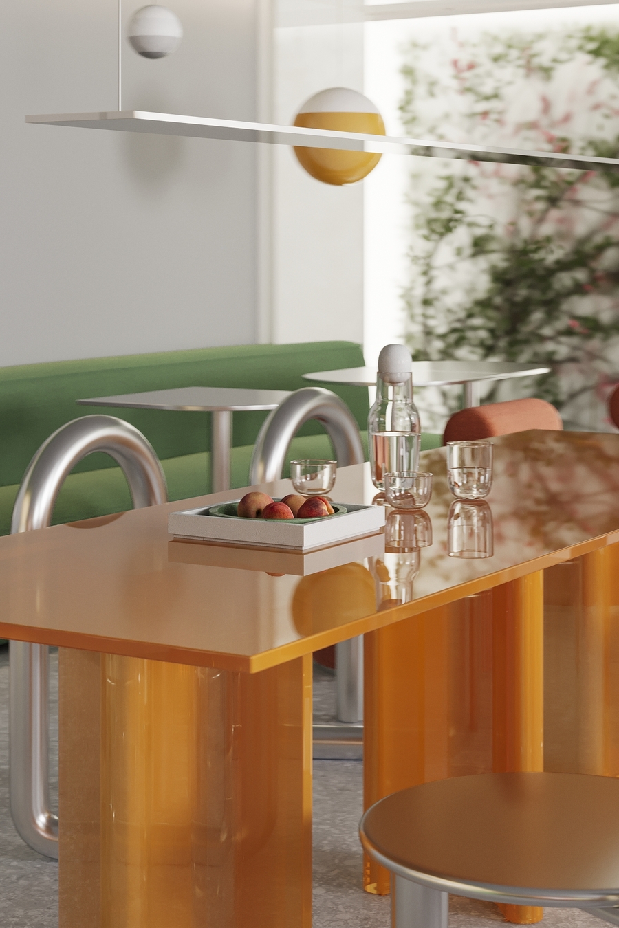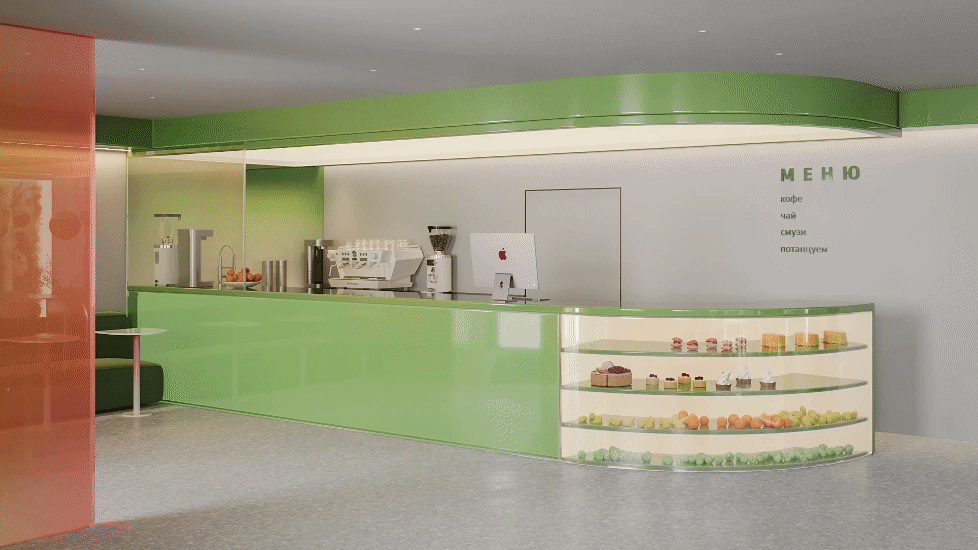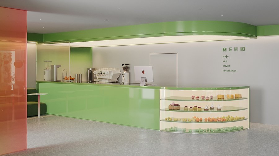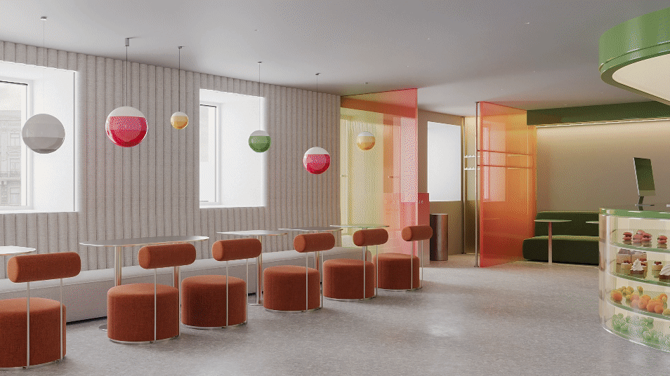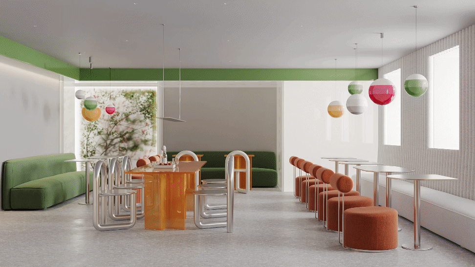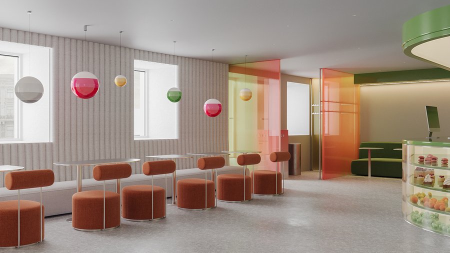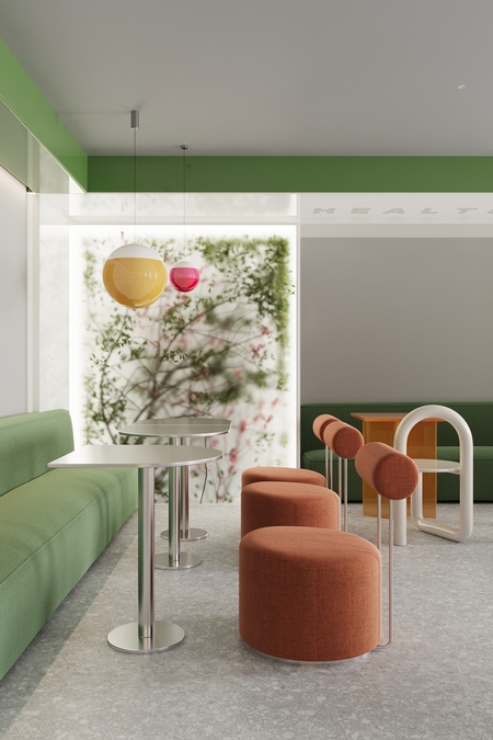 Морковные кресла, отражённый свет в материалах градиентного стекла, сферические подвесные светильники-конфеты и другие точечные акценты стали символами сочности, свежести и энергии вкусного healthy food