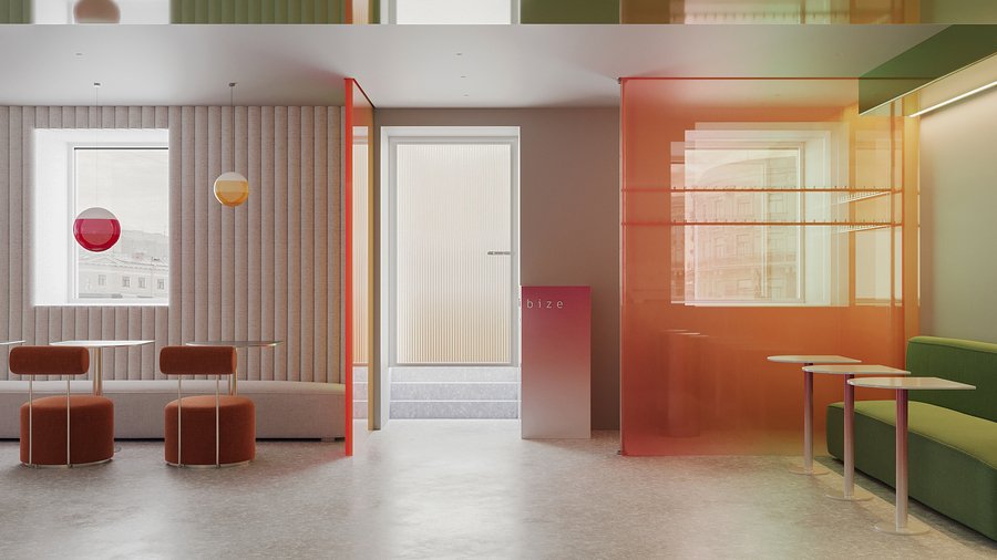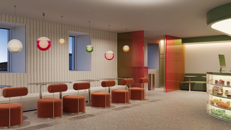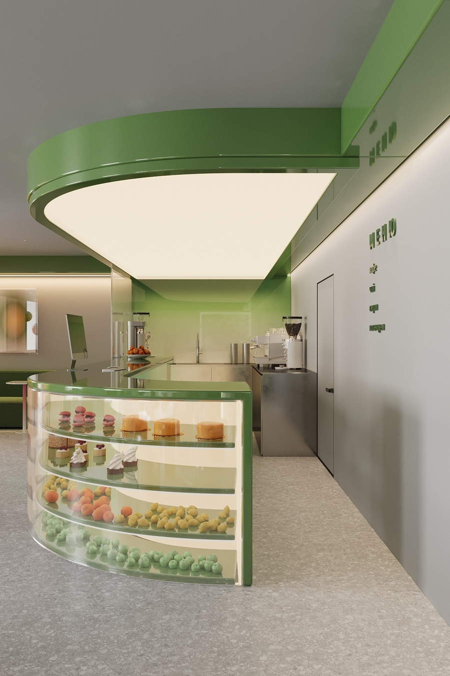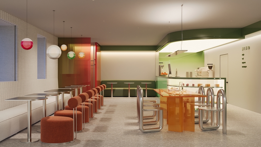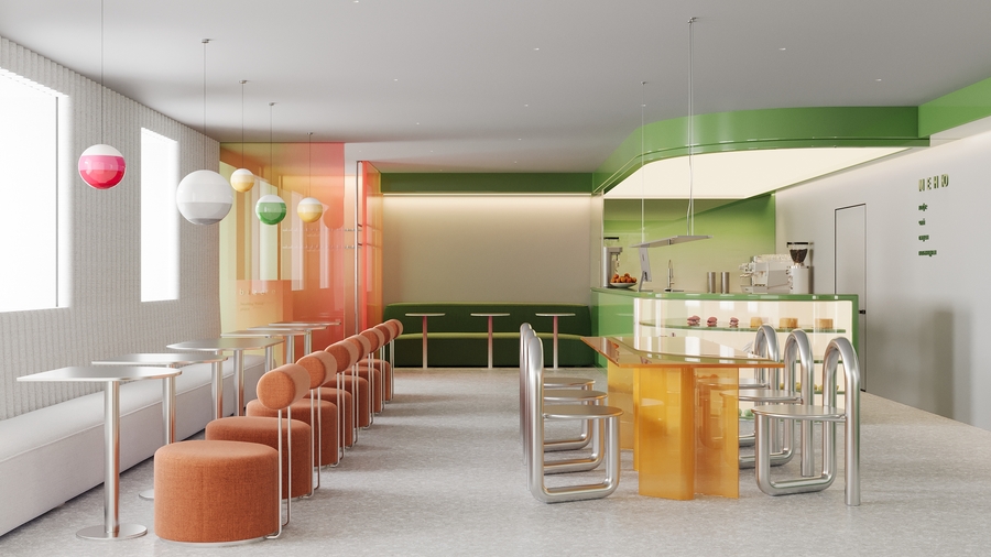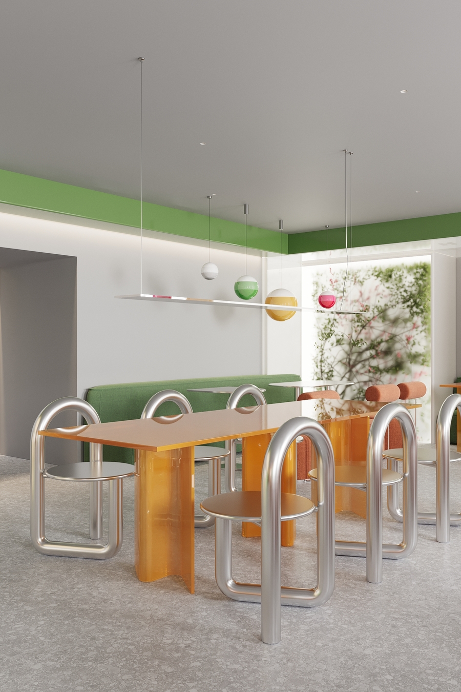 Морковные кресла, отражённый свет в материалах градиентного стекла, сферические подвесные светильники-конфеты и другие точечные акценты стали символами сочности, свежести и энергии вкусного healthy food