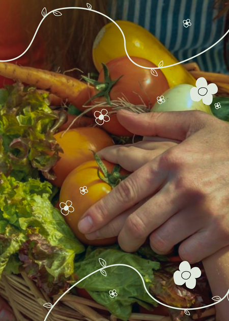 Далее я добавила векторные графические элементы в виде цветочков, стеблей и листочков, подчеркивающих тематику работы. Неровности линий и мелкие детали придают графическому стилю простоты и натуральности.