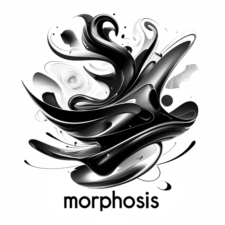 Prompt: the black and white logo of the festival of epoxy resin products. The name morphosis letters are refracted by transparent material.