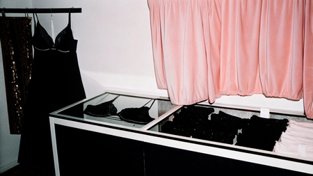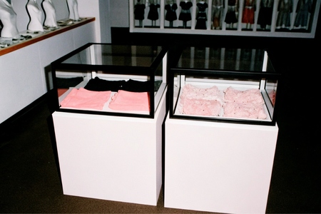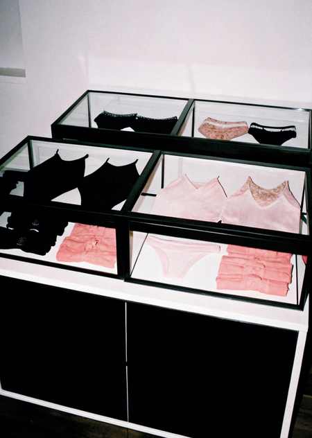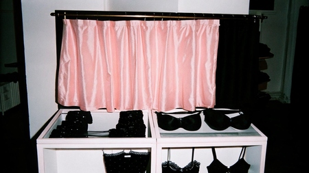 recraft; стиль — hard flash палитра — f4bebe; 696969; 000000 prompt: shop space with bra and underpants for underclothes brand. all products are closed behind a transparent PVC screen silicone curtains