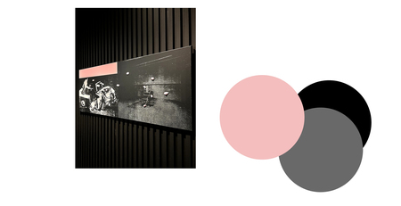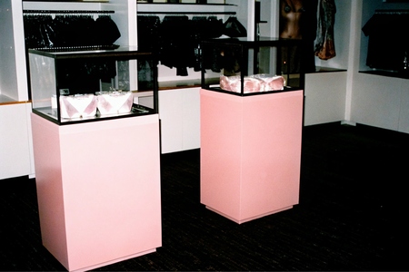 recraft; стиль — hard flash палитра — f4bebe; 696969; 000000 prompt: create a store space where the display cases have transparent screens behind which items of underclothes are located