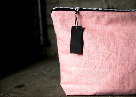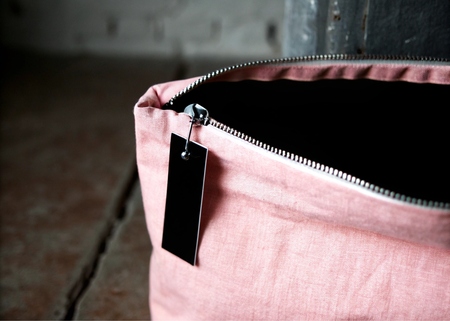 recraft; стиль — urban drama палитра — f4bebe; 696969; 000000 prompt: a cloth bag with a zipper and a paperclip tag attached to it