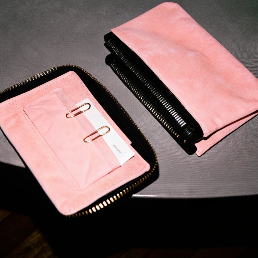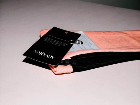 recraft; стиль — hard flash палитра — f4bebe; 696969; 000000 prompt: make a branded product «NARYADY» packaging from fabric with a zipper. use a paper clip to attach the receipt tag + встраивание лого в Photoshop