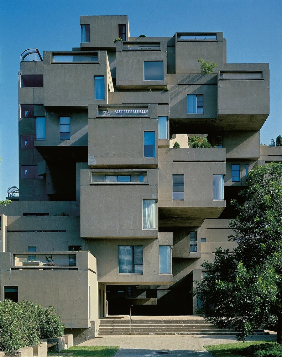 Моше Сафди использовал железобетонные блоки, которые производились на месте и затем монтировались краном в единую композицию. Каждый блок был самостоятельной конструкцией, но при этом становился частью сложной пространственной системы. Такой подход позволял архитектору создавать гибкую структуру, где комбинации модулей могли изменяться, образуя разнообразные типы квартир.