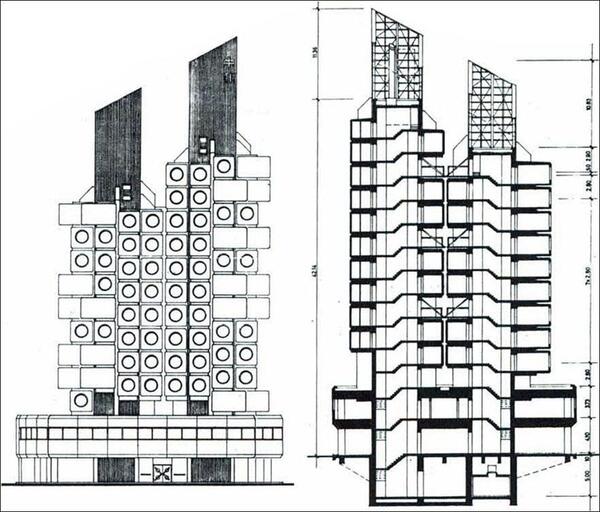 Капсульная башня «Накагин», Токио. Фасад и продольный разрез здания. // URL: https://en.wikiarquitectura.com/building/nagakin-capsule-tower/#nakagin-capsule-alz-y-sec (Дата обращения: 22.10.2025)