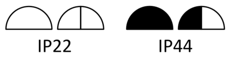 Степень защиты розетки указывается согласно ГОСТ 14254-96 «Степени защиты, обеспечиваемые оболочками (код IP)». Правило простое: если в полукруге есть закрашенная область — IP44, если нет — IP20.