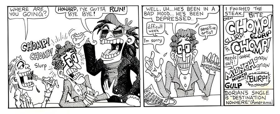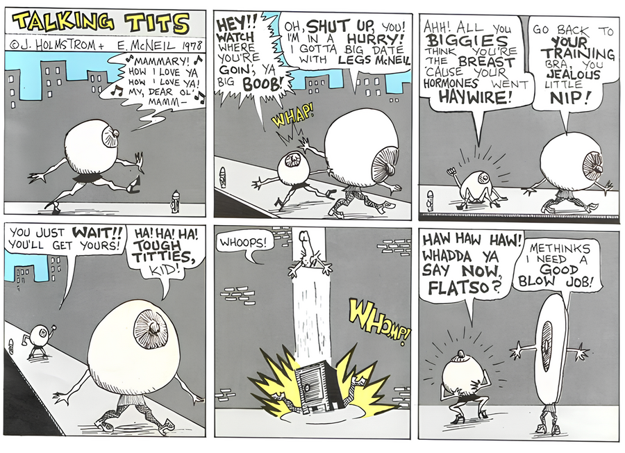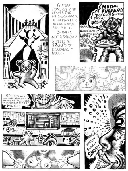 Комиксные зарисовки, выполненные все в том же карикатурном стиле, зачастую описывали абсурдные сюжеты. В этих историях изображались отталкивающие и непристойные для массовой культуры персонажи, которые по-черному шутили на злободневные темы. Также частым приемом становится визуализация звука, которая используется нарочито часто, поддерживая атмосферу хаоса и провокационности.