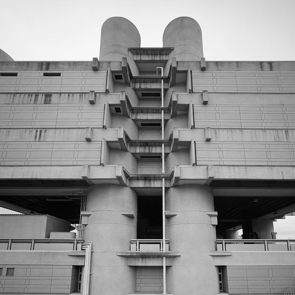 Фасад — многоуровневый бетон, глубокие ниши, мощные выступы, сложная игра светотени. Работа с массой и светом, скульптурная тектоника, рельеф. Фасад как высказывание инженерной сложности и художественной массы.