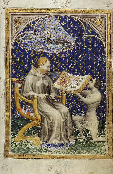 Слева: Миниатюра «Жан де Водетар преподносит свой труд, Историческую Библию, в дар от короля Карла V», Жан де Бондоль, 1372 Справа: Миниатюра «Всеобщая хроника Рудольфа фон Эмсаи Карл», Der Stricker