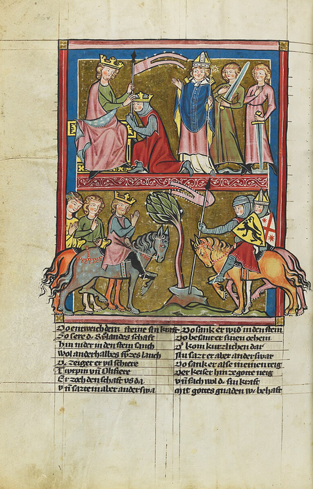 *Миниатюра «Всеобщая хроника Рудольфа фон Эмсаи Карл», Der Stricker написана в 1300 году.
