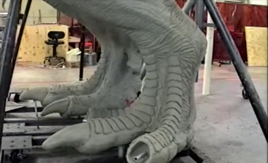 1993 год: выражение механически ограничено (несколько предустановленных позиций), влажность рта добавлена вручную (слизь из силикона), текстура показывает индивидуальные чешуйки, созданные вручную, результат: ощущение реального механического существа