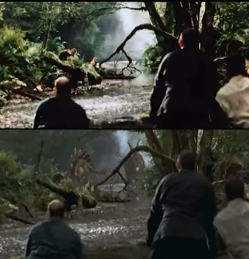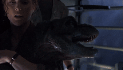 Таким образом мы видим, что в фильме 1993 года аниматроника используется для крупных планов при показе динозавра, а чтобы показать Рекса полностью в кадре и с активным движением используется CGI. Как я уже упоминала, аниматроника могла достичь скорости лишь 15 км/ч, то есть физически не смогла бы бежать за автомобилем