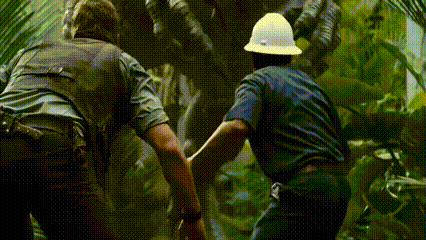 фрагмент из фильма «Мир Юрского периода» (2015). бегущие динозавры