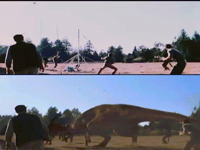 1993 год: движение плавное, но медленное (макет не может двигаться быстро), тени живые от реального объекта, взаимодействие с пылью органичное (пыль реально поднимается), при близком рассмотрении видны волоски и швы на латексе