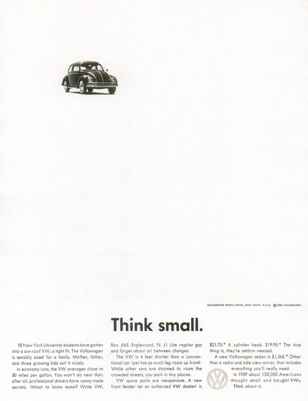 Для американского рынка Volkswagen Beetle кажется слабым и маленьким. Создаётся впечатление, что на эту модель не будет спроса, поэтому маркетологи Volkswagen Делают акцент на простоте и экономичности: покупка недорогая, бензина требует мало, ремонтировать проще и дешевле. Автомобиль позиционировался как идеальное средство для простого человека, которому не хочется забивать себе голову лишним, после покупки автомобиля. Это было прямое попадание в целевую аудиторию. Плакат ниже как бы говорит, что машину практически невозможно убить, а значит и проблем она не доставит.