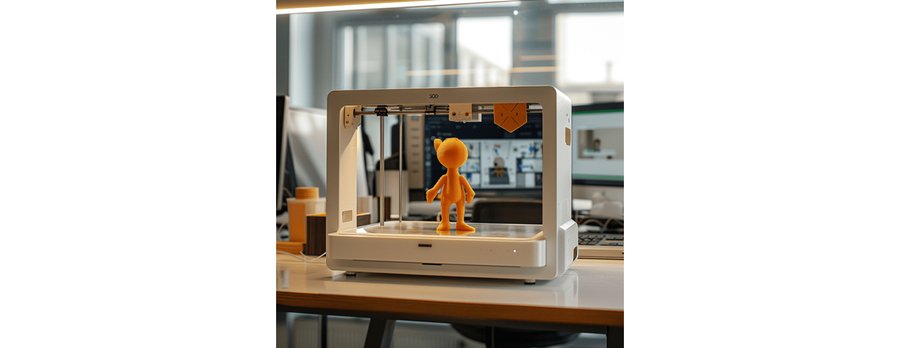 [3D принтер на столе, внутри принтера печатается мультяшная минималистичная фигурка, реальное фото]