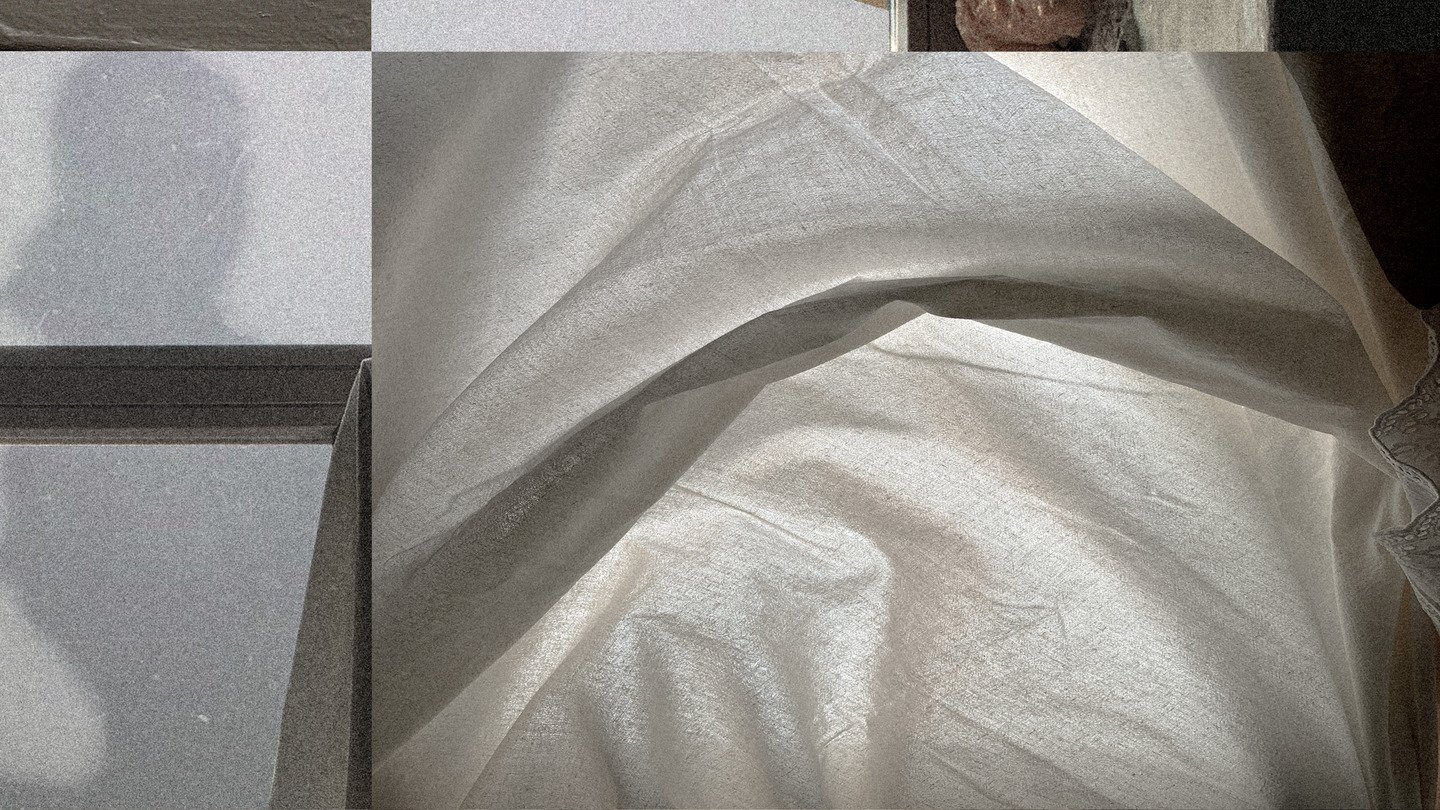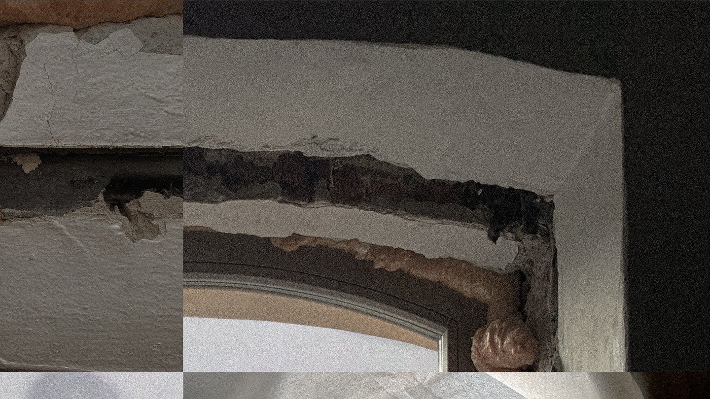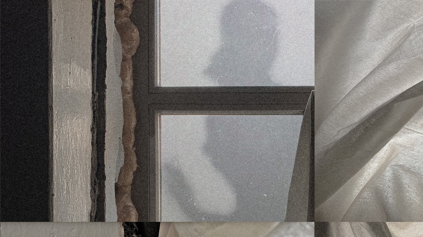 Фотография построена как одна постановочная сцена, разбитая на несколько фрагментов. Каждая часть — это отдельное состояние героя, визуализированное через предметы: портальное окно, строительная пена, камень, списки бумаг, ткань с кружевом, женская тень, стена.