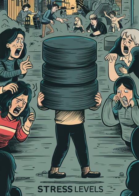Prompt: «A chaotic urban scene where a massive, stacked object, resembling a server or database, is being held aloft by a person. Surrounding this central figure are several distressed individuals, some falling, others reaching out, and a few observing the scene from a distance. The backdrop showcases tall buildings, a cloudy sky, and debris scattered around. The title ’STRESS LEVELS’ is written at the bottom, suggesting the overwhelming emotions and challenges depicted».