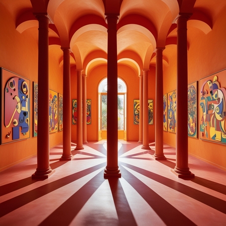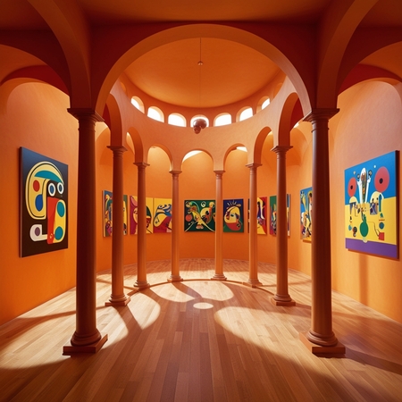 promt: warm orange walls adorned with arches and a colonnade that encircles the room, forming a central axis, where a series of slender columns rise to meet the ceiling, upon which the artist’s paintings are showcased, featuring abstract shapes, vibrant colors, Miró's, with the artist’s signature biomorphic forms and geometric patterns across the walls, amidst a warm, golden light that casts long, shadows, evoking the essence of Miró's artistic vision.