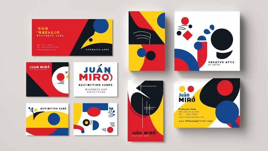 promt: A collection of business cards and exhibition cards inspired by the vibrant style of Spanish surrealist artist Juan Miró, color palette dominated by bright red, sunshine yellow, dark blue, and black, with geometric shapes and abstract forms, the cards showcasing a mix of clean lines, and whimsical illustrations, with the artist’s signature biomorphic elements and curvilinear lines, set against a contrasting white background.