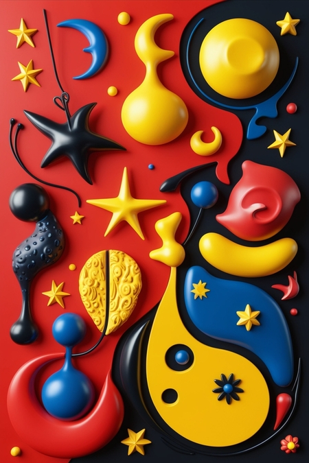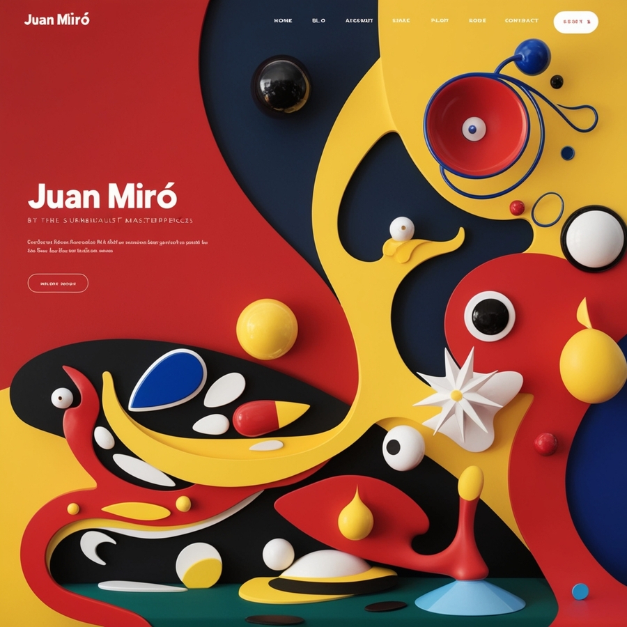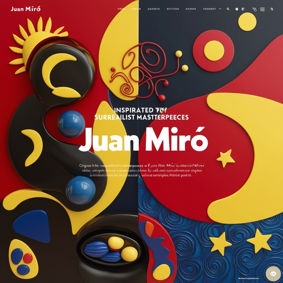 promt: a website design inspired by the surrealist Juan Miró, color palette dominated by fiery red, sunshine yellow, deep dark blue, and rich black hues, with whimsical shapes and biomorphic forms reminiscent of Miró's iconic artistic style, incorporating organic textures and flowing lines, the website’s layout and typography should reflect the artist’s aesthetic, with bold sans-serif fonts and irregular shapes, and incorporating Miró's famous motifs such as stars, moons, and abstract creatures.