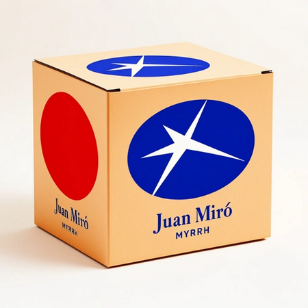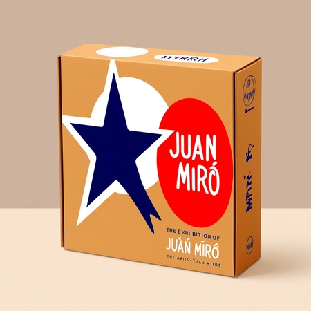 promt: a package box for a product that shows the logo of the artist Juan Miró depict on it a blue star intersecting a red oval and the inscription of myrrh in white color with the artist’s signature a logo for the exhibition of Juan Miró with a dark blue star intersecting a red circle in the middle, Miró's signature in the handwriting of the artist Juan Miró