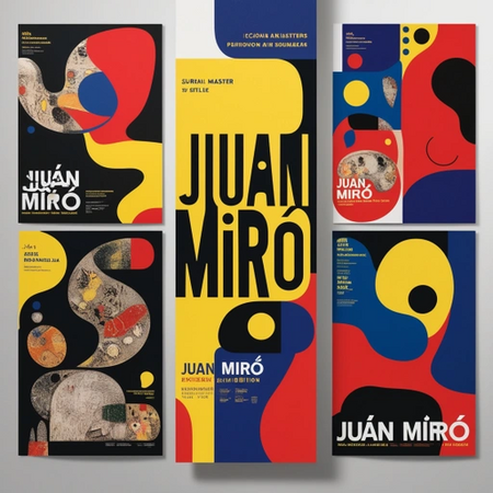 promt: a series of vibrant posters for Juan Miró's exhibition, integrating fragments of his iconic paintings, typography, and a color palette dominated by black, bright yellow, deep dark blue, and fiery red. The posters should evoke the surrealist master’s unique style, blending biomorphic forms, geometric shapes, and abstract elements. Incorporate Miró's signature typography, characterized by playful, curvilinear lines and bold strokes, to highlight the exhibition’s title and details. The composition should be dynamic, with visual tension and balance achieved through the juxtaposition of contrasting shapes, colors, and textures. subtle textures and embossing effects. The overall aesthetic should be modern, avant-garde.
