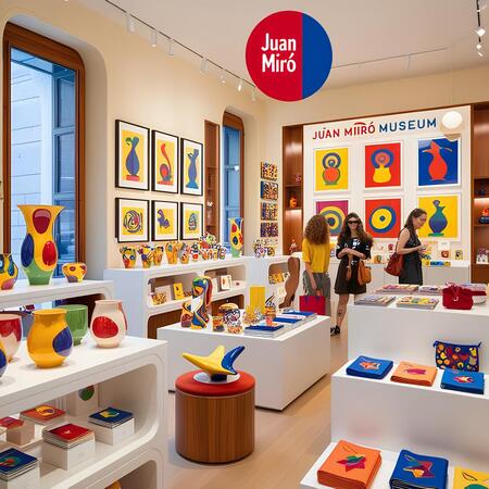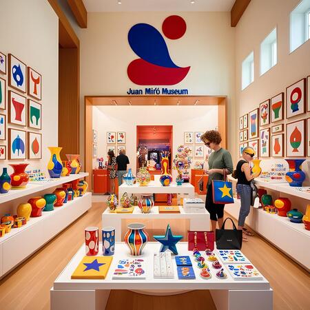 promt: a vibrant and modern store interior set within the Juan Miró Museum, filled with an array of colorful Juan Miró-inspired merchandise, including ceramic vases, sculptures, and prints featuring his signature biomorphic shapes and bold lines, alongside Miró-postcards, notebooks, and tote bags, all arranged on sleek white shelves and display tables, with sculptures and art pieces throughout the space, and large windows allowing natural light to pour in, highlighting the playful and whimsical atmosphere of the store, with a few customers browsing the shelves, one with curly brown hair and bright yellow sunglasses, and another with a tattoo of a Miró-esque star on their left ankle, all set against a backdrop of creamy white walls adorned with framed Miró artworks and a large, bold, red and blue logo of the museum above the store’s entrance. hyper realistic people