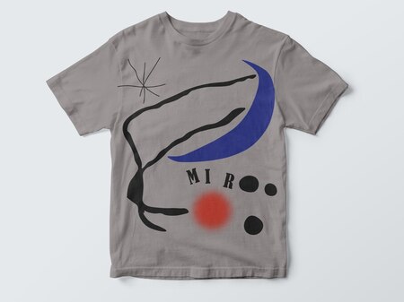 promt: a vibrant and display of Juan Miro-inspired merchandise, featuring a variety of products such as t-shirts, mugs, posters, and tote bags, all adorned with his iconic surrealist artwork, characterized by bold lines, playful shapes, and a palette of bright blues, reds, yellows, and whites, showcasing a mix of products with different designs, some featuring single motifs, others with repeating patterns, and a few with bold text overlays, all against a clean white or light gray background, with precise details on fabric textures, subtle shading, and realistic folds and creases on the clothing items.