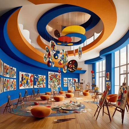 promt: a vibrant art space inspired by Juan Miró's unique style, with undulating, curved blue walls that evoke a sense of dynamic energy, where an array of the artist’s bold, abstract paintings hang, each one bursting with primary colors, organic shapes, and expressive brushstrokes, sleek furnishings, with scattered easels, paint-splattered palettes, and half-finished canvases.