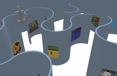 promt: a vibrant art space inspired by Juan Miró's unique style, with undulating, curved blue walls, where an array of the artist’s, abstract paintings hang, each one bursting with primary colors, organic shapes, and expressive brushstrokes, set against a backdrop of warm, golden wood floors and, illuminated by an abundance of natural light.